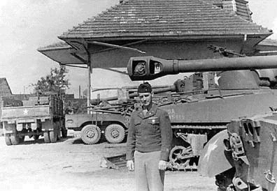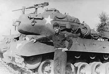 Here I am, standing in front of a T-26, one of the new Ford tanks we got when the war ended. I'm very proud to be holding my hand onto the fender of that thing, more powerful than anything we had. Just give it a little gas, put a little water in the radiator, and man that thing had more power than you'd believe. |