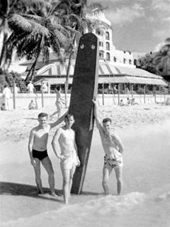 I had sent a copy of this photo to my brother in the army shortly after we had arrived in Honolulu. I am the one in the black trunks posing with a surfboard in front of the Royal Hawaiian at Wiakiki. An ordinance officer in Patton's 3rd Army, he received it during the Battle of the Bulge. I think he decided life wasn't fair! He told me later that I sounded very different in my next letter.