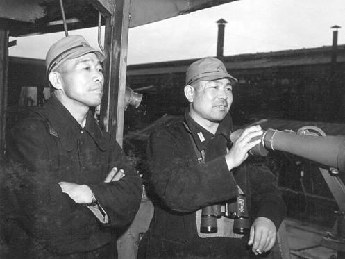 high on the Nagato’s superstructure. Below: US naval officers getting a look at the mechanisms
