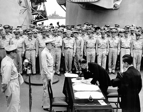 Japanese delegation’s arrival on the USS Missouri for the signing of the