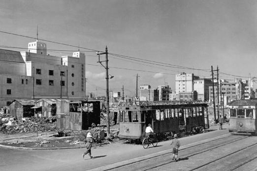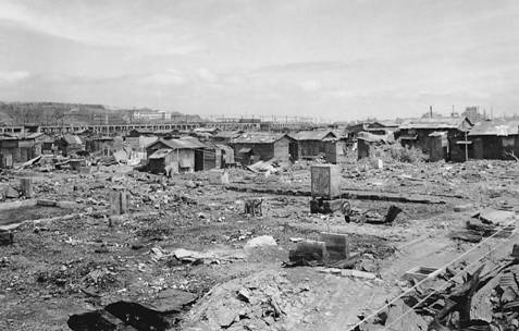Yokohama fire-bombing damage. The shacks were put up from salvaged tin roof materials